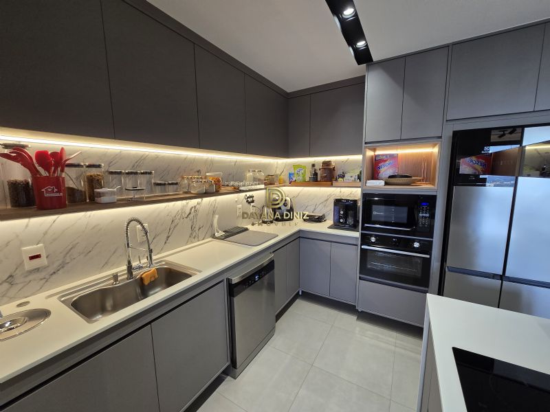 Cozinha completa com eletrodomésticos de alto padrão (geladeira 4 portas, lava-louças, forno, micro-ondas, coifa, fogão de indução, cervejeira/adega e triturador)